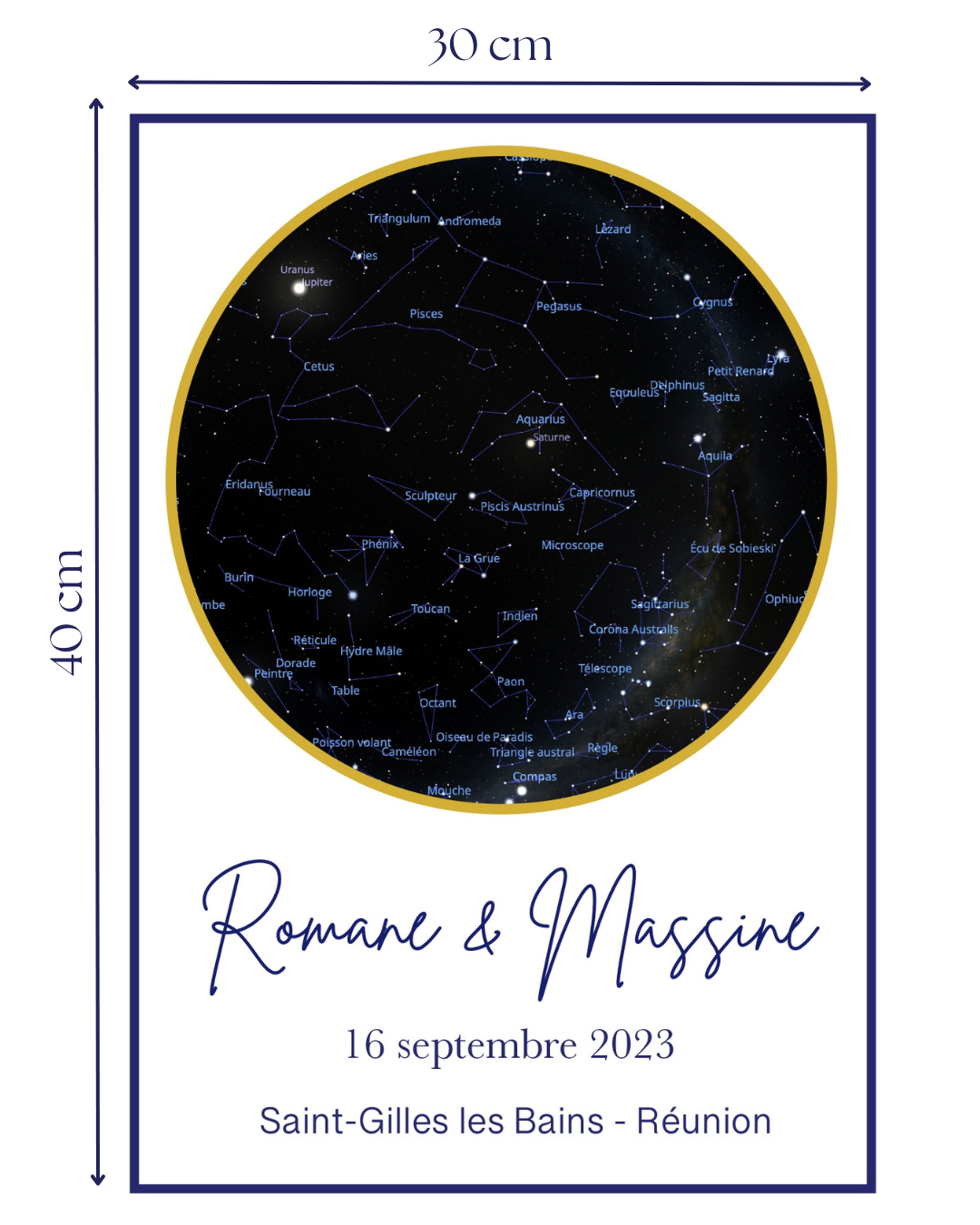 Avec l’affiche de la Collection Astralis, vous découvrez le ciel exactement comme il était à l’instant de votre événement : la position des étoiles, la Voie lactée, les constellations… tout est authentique et calculé à partir de données astronomiques réelles.