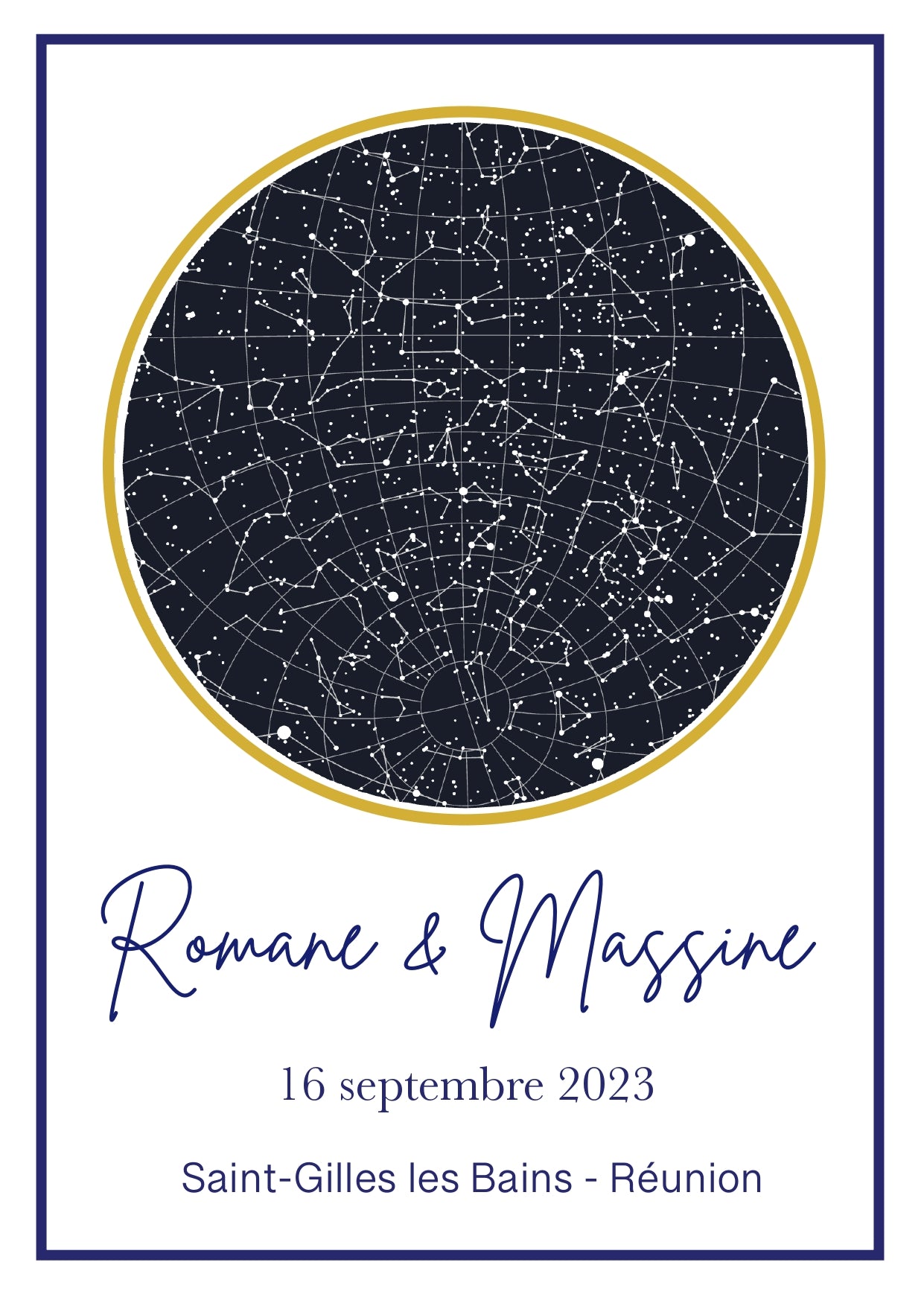Chaque affiche représente fidèlement la position des étoiles, des planètes et des constellations à une date et un lieu choisis par vous. Mariage, naissance, rencontre inoubliable… Immortalisez ces instants magiques avec une œuvre céleste conçue spécialement pour vous.
